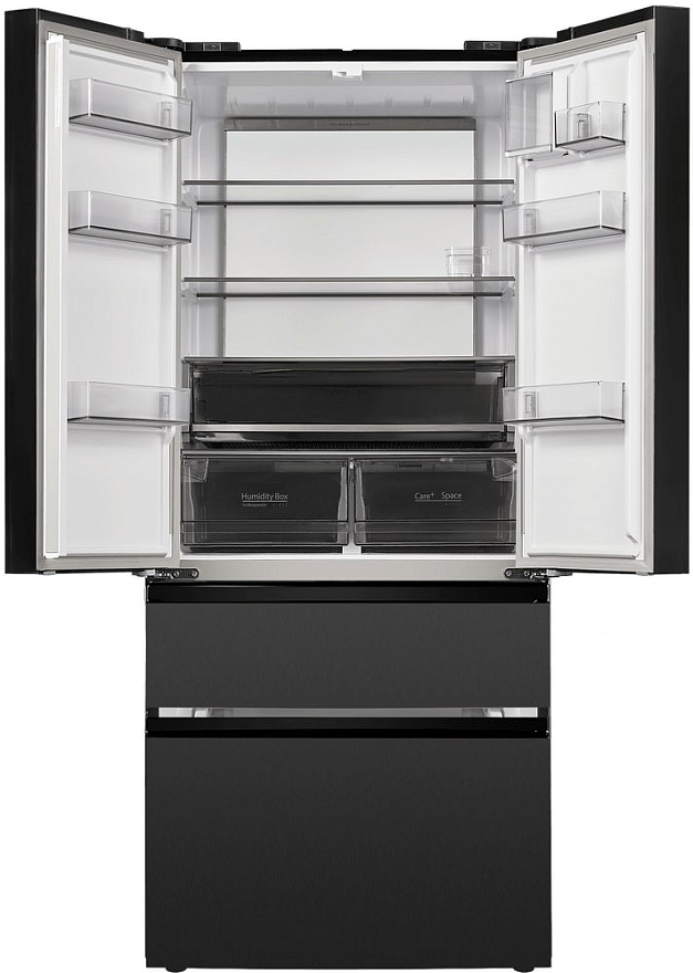 Внутри холодильника расположены три полки из закаленного стекла и семь полок на двери, а также два ящика для овощей и фруктов. В морозильном отделении предусмотрено два ящика. Все это обеспечивает удобное размещение продуктов и их быстрый доступ.