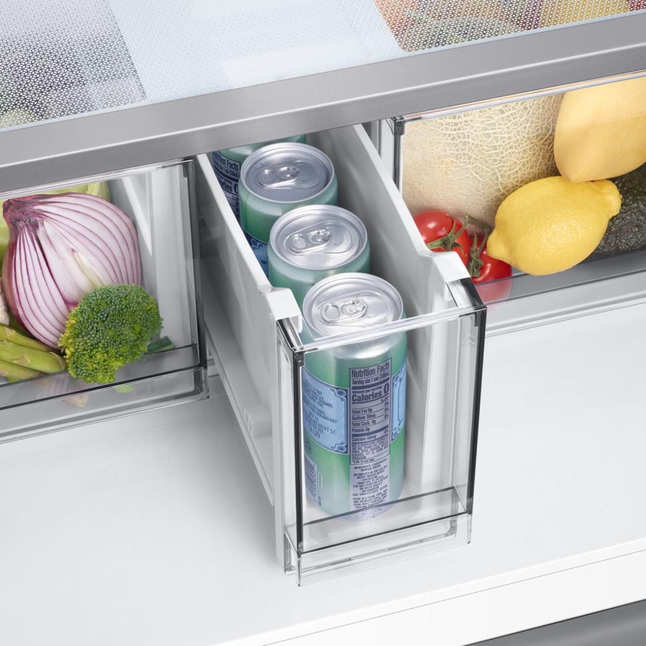 Морозильная камера расположена в нижней части и состоит из 2 отделений, оборудована 2 закрытыми и 4 полуоткрытыми ящиками, 6 дверными карманами, а также контейнером для льда. Мощность замораживания — 12 кг/сутки. Доступны режимы: суперзамораживания, суперохлаждения, быстрого охлаждения, легкой заморозки, нулевой температуры и охлаждения напитков.